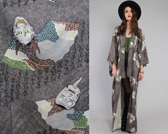 Vtg Antique Grey DEMON Print Japanese Kimono Duster by theindustry